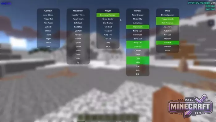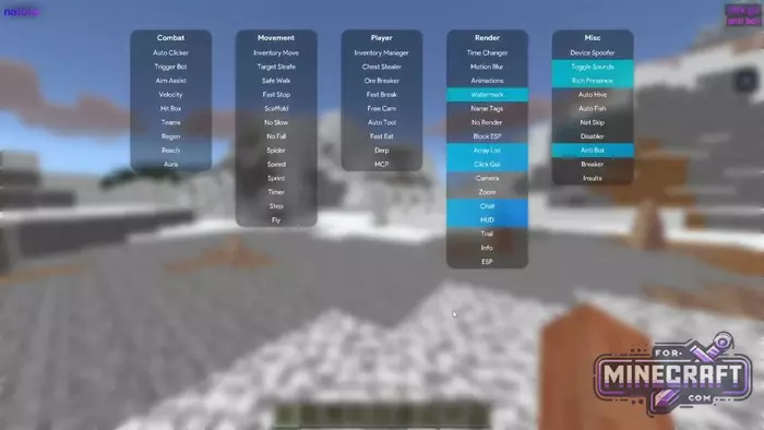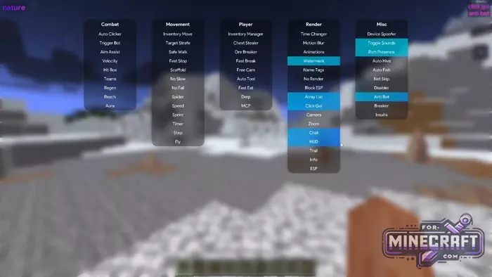 The functionality in Nature Hack Client is divided into logical groups. "Combat" contains classic items such as Kill Aura and Reach, while the 'Movement' section is responsible for movement. "Player" contains routine automation for example, Chest Stealer takes items from chests itself and Ore Breaker helps with resource gathering.