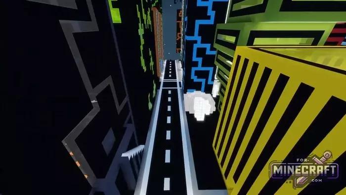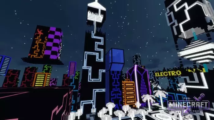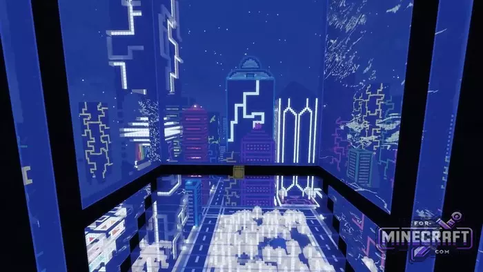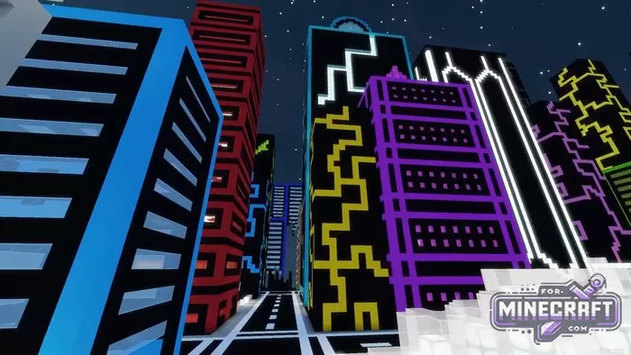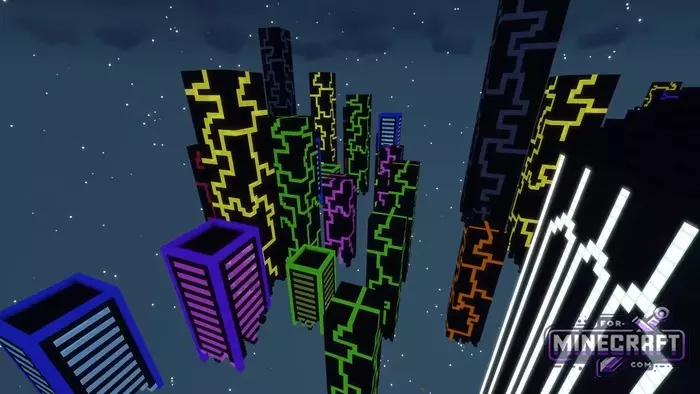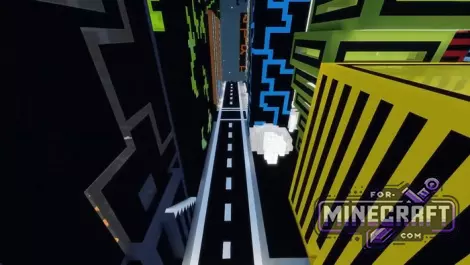A futuristic metropolis with bright ultraviolet lights, where you will participate in a scavenger hunt (although you can also use it for walks or role-playing games as the city is perfectly suited for this). The city has cyberpunk references, and if you need items that fit the theme, download the Craftpunk Addon available for Bedrock 1.21 & 26.0.