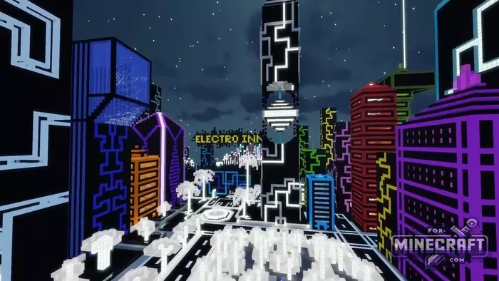 - Use of glowing blocks to create the effect of a futuristic nighttime metropolis.