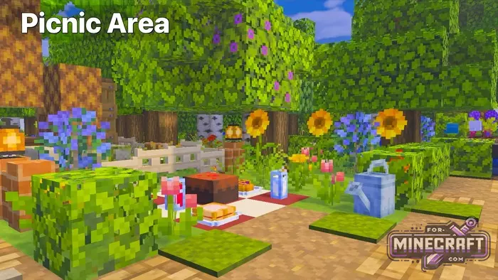 Advanced Farming World has a bunch of little details that help create the atmosphere. In the garden you can find peacocks walking among the trees, and cozy benches in the shade of fruit trees. There is also a picnic area with a blanket spread out on the grass; covered with cakes and sandwiches.