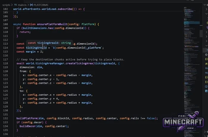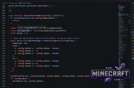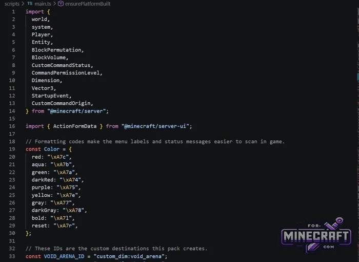 To begin, you'll need to register a custom dimension using the API. To do this, use the event.dimensionregistry.register command, which registers a dimension with an identifier (e.g custom_dim_void_arena). The code also includes a user interface that allows you to enter this dimension, as well as add platforms and other objects.