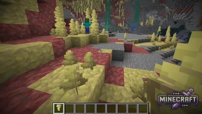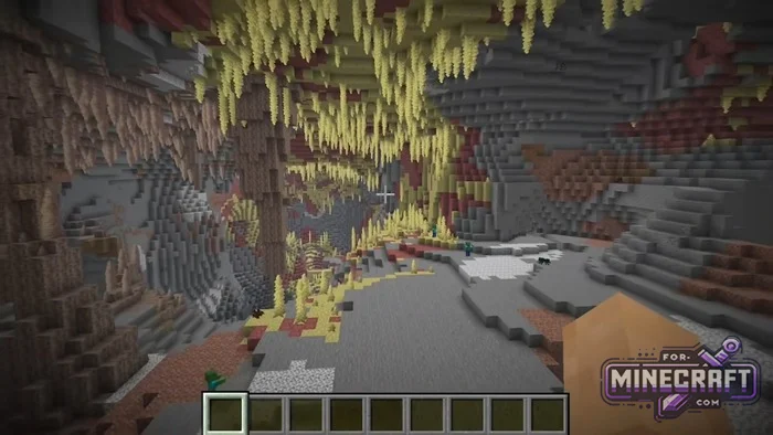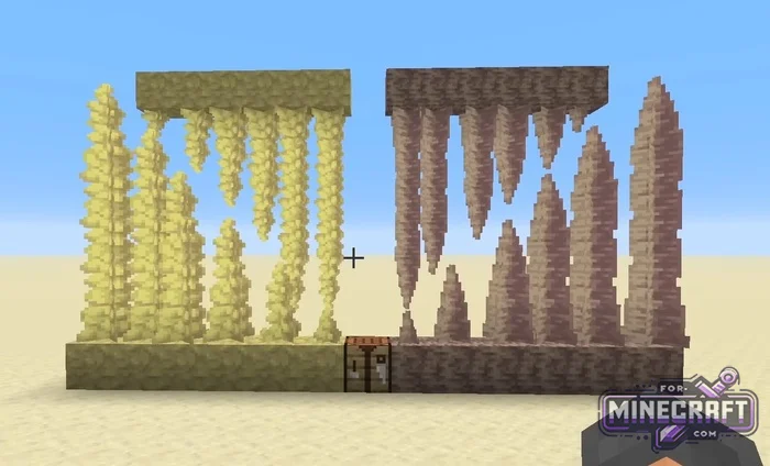 Now, in caves you can come across sulfur spikes that grow on sulfur or cinnabar deposits. They grow both from above as stalactites and from below as stalagmites. If you connect several of them, you'll get a long spike. The main safety rule in Bedrock 26.30.20 is that you can walk on them safely but if a stalactite falls down, you'll take significant damage.