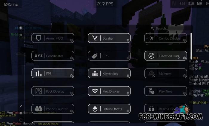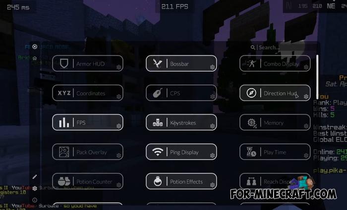 - Includes 50+ options and hacks (legal) tailored for PvP, such as Keystrokes, Old Animations, Custom Crosshair, and many others
