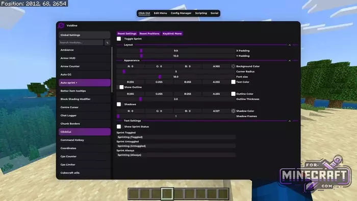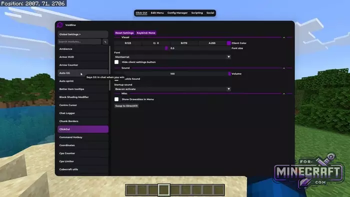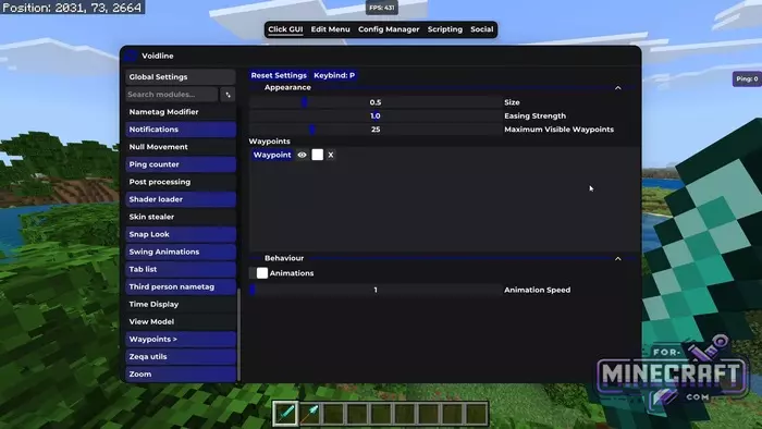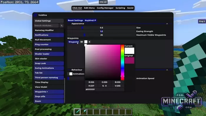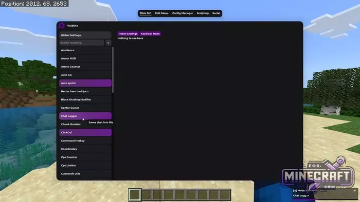 Visually, VoidLine Client is designed in dark purple tones. The main menu is accessed by pressing the K key; opening access to a list of 50 modules. For convenience, there is a "Config Manager" where you can not only customize your own profiles but also download ready-made presets from other players, for example for playing on the Hive server (many are intrested in Hive in particular).