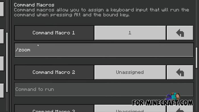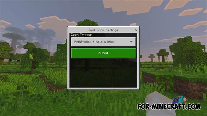 Unlike zoom items, Easy Zoom requires nothing. Zooming works by pressing keys or combinations: holding a stick, an item named "zoom," crouching or double sneaking. This is especially important on mobile - zoom is activated by the usual press and there is also a setting via the /setting command where you can choose a convenient method (see screenshot).