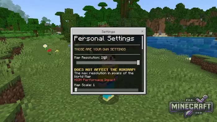 Use settings if you want to customize the map. Here you can turn the detail up to the maximum (if your device allows it) or change the scale. For example the fix mode gives you a huge overview, turning the mini-map into a full-fledged navigator across biomes, which is definetly useful.