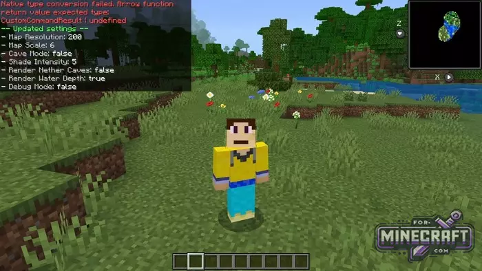 For mining enthusiasts, there is a "cave mode" that switches rendering to underground structures, and if the small window isnt enough the slashmap command expands the image to full screen. Control this view by jumping and moving forward and to return to the game simply crouch once.