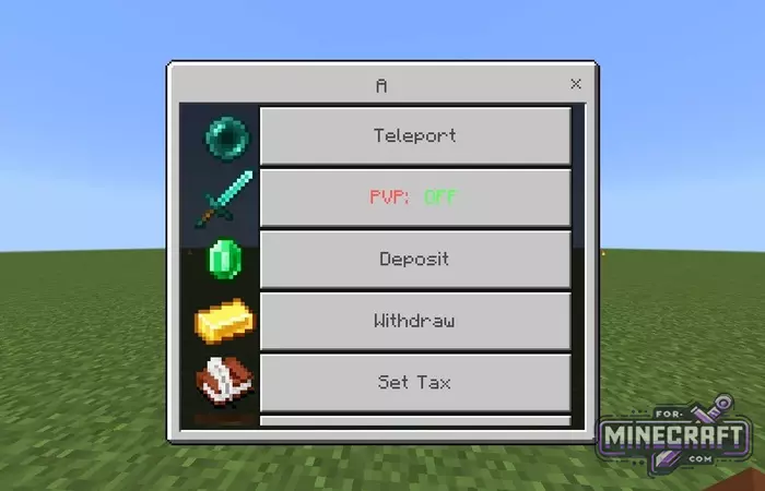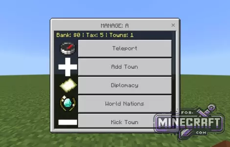 In addition, Towny Bedrock Addon allows you to flexibly customize life within your state. In the settings, you can disable or enable PVP. If someone is interfering they can be excluded. There is also a system of ranks and permissions that determines who can build and who is just a guest. There is a teleportation function for moving between points.