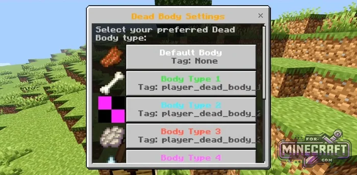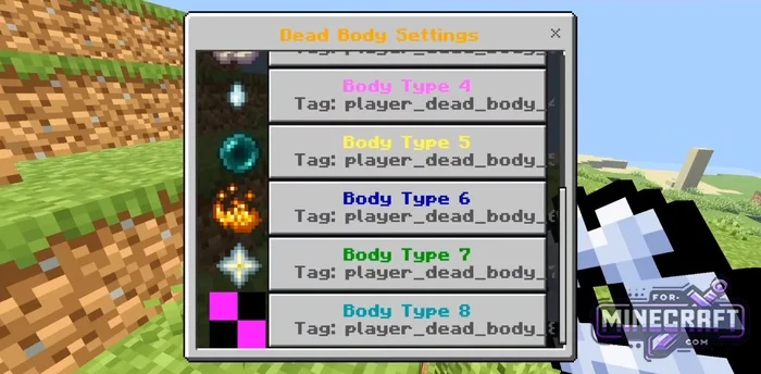 You can also change the appearance of the corpse. By default, it is a standard model, but you can upload up to eight of your own skins. To do this, you need to go into the addon files and replace the textures in the custombody folder. With the corpse model change item (crafted at crafting table), you can choose which skin will be displayed after death.