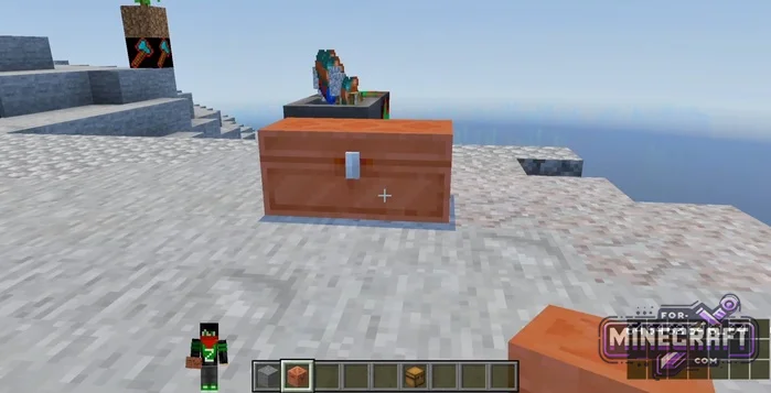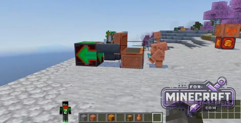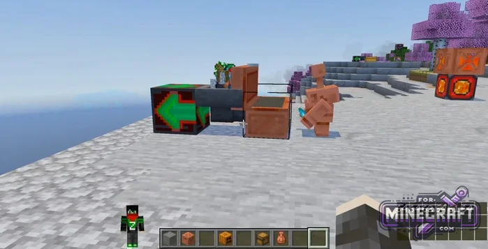 There's an Item Magnet that pulls everything within a 30-block radius. It has a directional indicator-items are teleported wherever the arrow is pointing. You can also summon copper golems or farming golems. They act as living sorters-picking up items and distributing them to the appropriate chests.