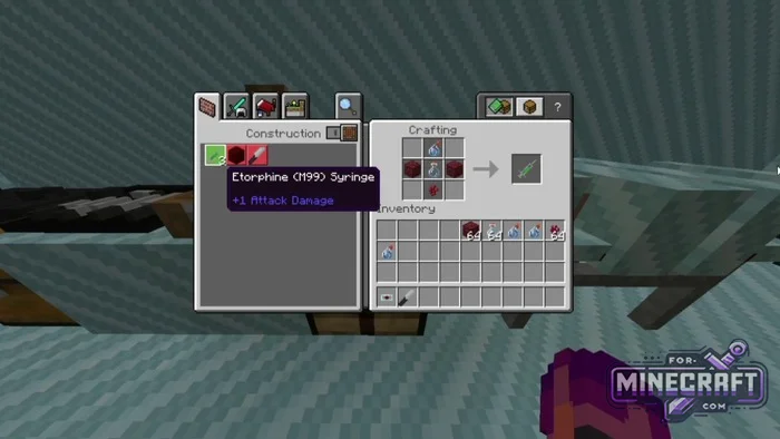 For the job, there's a Dexter suit and a knife. Its made from a stick and an iron ingot, dealing 4 damage. But the most interesting item is the syringe with M99-if you inject a mob or another player, their vision will darken, theyll feel nauseous, and they'll slow down (the effect lasts for half a minute).
