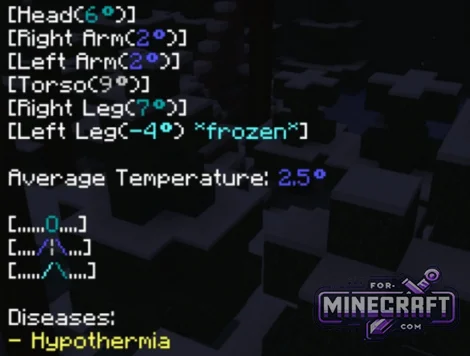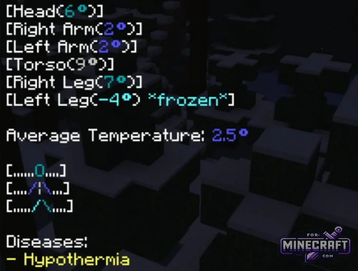 In the desert or the nether, you can get heatstroke; in the snow you can get frostbite on your limbs. Additionally, radiation has been introduced and while it's low in the desert it's high in the Crimson Forest. Without potassium iodide pills you wont last long there, as you'll start getting infected, and as you can see traveling through biomes is quite a challenge you need to gear up and bring a supply of health potions.