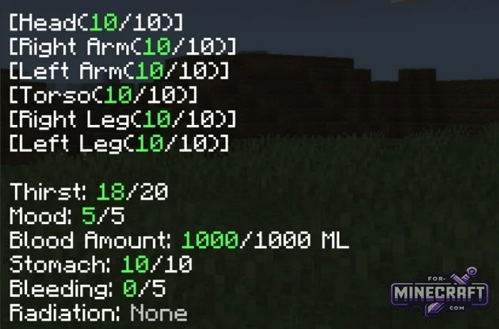 You can bleed out and your health wont regenerate on its own. You'll also have to balance thirst with the risk of getting sick from drinking raw water, which leads to stomach inflamation and the inability to eat. And then there's your mood, which also plays a role illnesses and injuries can drive you into depression. You can take antidepressants, but you might become dependant on them. And there are tons of features like this in the add-on.