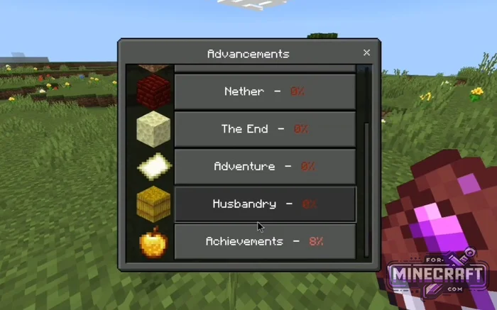 Progress is organized by category, such as Minecraft, Nether, or The End. A general counter shows how many of the available tasks have been completed so far displaying the result as a percentage. Use /showui for a list of achievements, and /showplayerui for commands, allowing you to check others progress. Notification settings are also avaliable via the /toasts command.