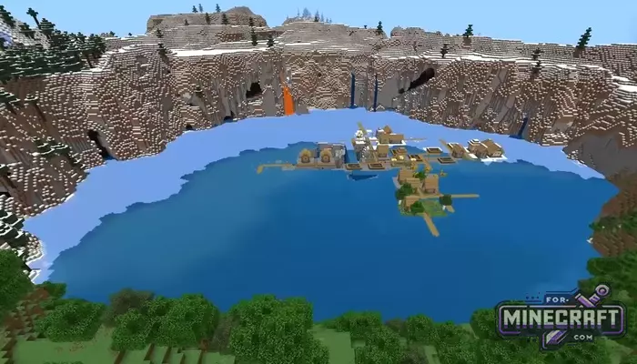 Using this seed, you will spawn on a snowy slope overlooking a giant bowl. It is a huge frozen lake surrounded on all sides by high mountains..