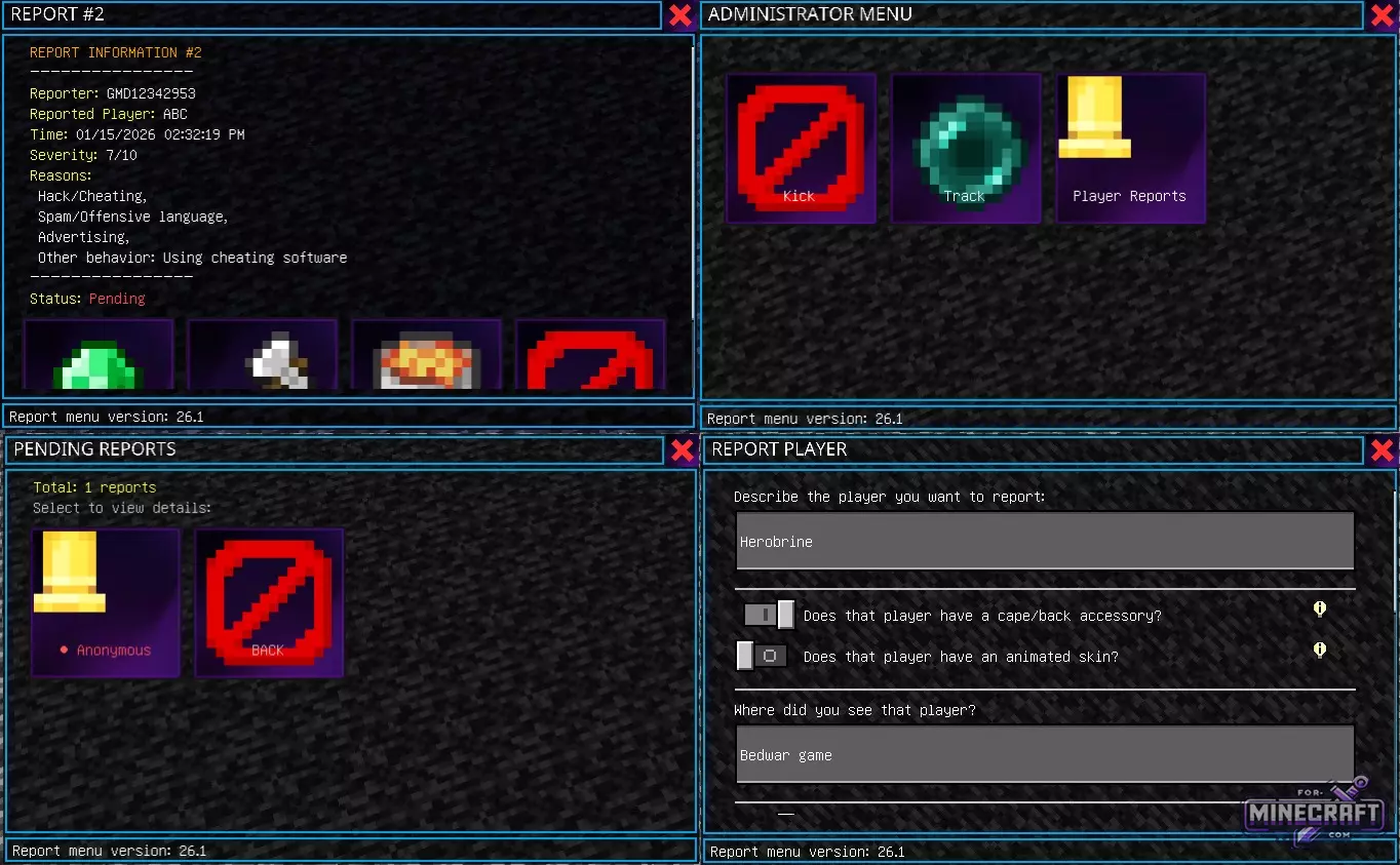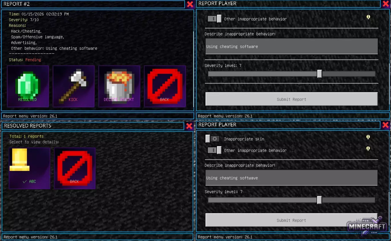 No need to search for text commands or a server group/channel to report a violator. The Report UI Plugin lets you send complaints directly from the server through a convenient menu. It also has a control panel where administrators can review complaints and make decisions. It is essentailly a full-fledged server plugin that also supports Bedrock Realms.