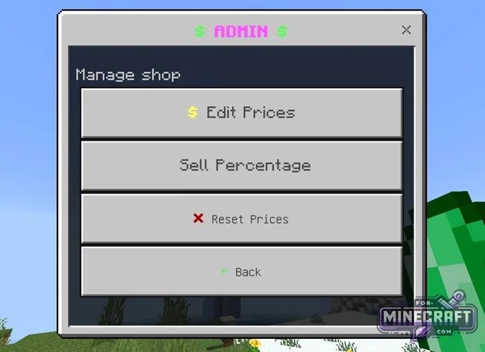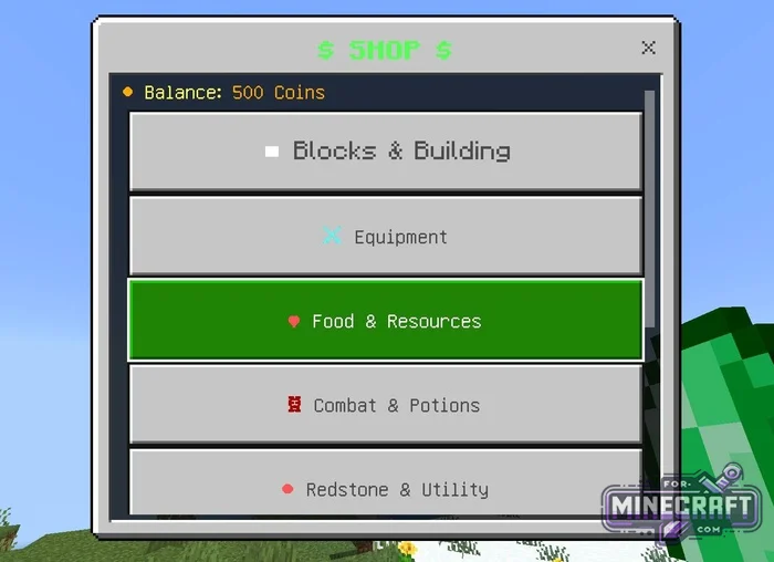 The Shop System lets you not only spend but also earn. In the buyback menu, you can sell extra resources. For example, a stack of emeralds will give you a fixed amount of coins, which you can then spend on something.