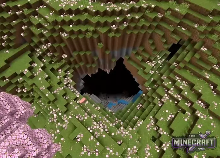 For those who prefer a secluded life the seed has prepared a cave right inside the cherry hill. There is a deep chasm hidden there - an ideal space for a multy-level base, as well as a source of ore and stone.