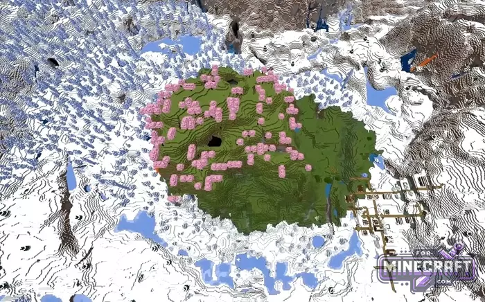 A small but sufficient island surrounded by snow and next to a lived-in village - that's exactly what this seed offers. It's a good place to build a mansion in a snowy location, and thanks to the village you wont be lonely.