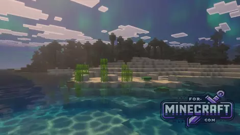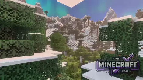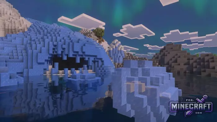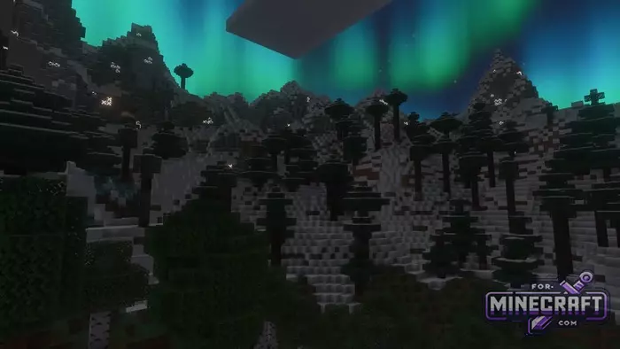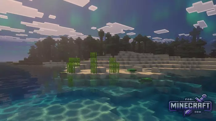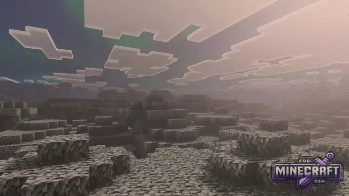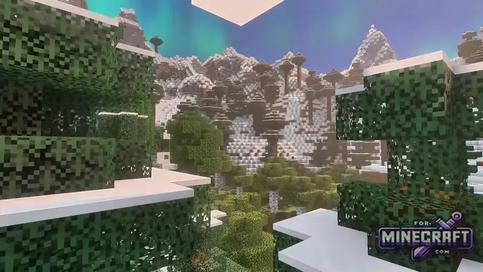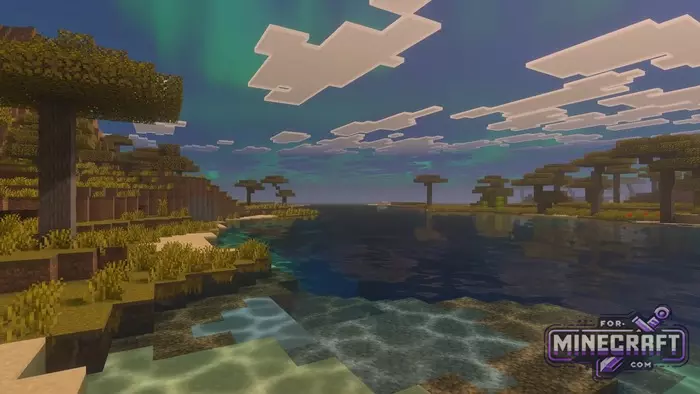 Unbound Shader emphasizes softness and cinematic quality in Bedrock Edition thanks to Vibrant Visuals. Instead of sharp rendering boundaries a new fog system has been added for a better sense of space. Perhaps the main feature of the shader is its work with the sky and lighting. For example, the northern lights appear over cold biomes and blend in with the overall lighting rather than looking like a hanging picture. See below for details.