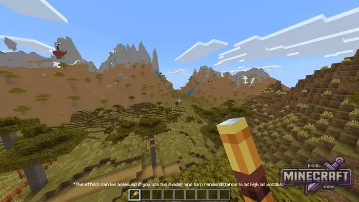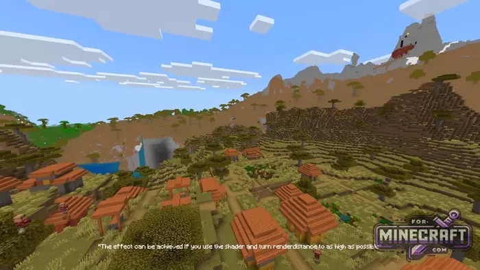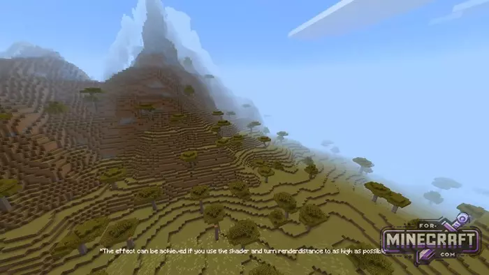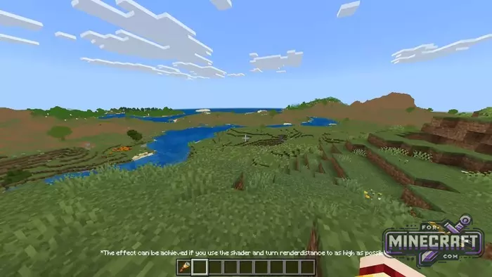 The shader simulates the Distant Horizons effect from Java Edition, but in Bedrock. The idea is simple: distant chunks are rendered in a simplified form with fewer details, which means less load but the horizon looks like the render distance is set to maximum. The screenshots show mountains, rivers and forests appearing in the distance, which wouldnt have loaded without the shader.