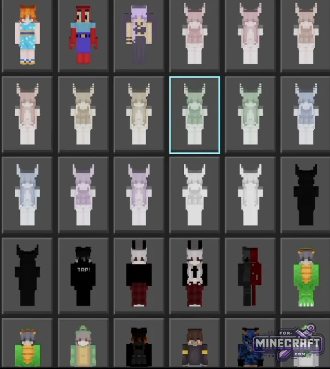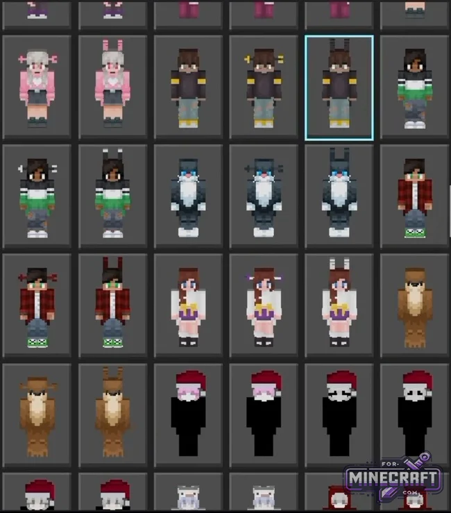 This is a large skin pack with over 300 skins in one, and everything is packed into an apk for Android and a zip archive for iOS and PC. It works on version 26.2 including Hive-type servers and others like them. It's a very diverse collection - there are skins with animal ears and tails, several versions of rabbits, cats, foxes, plus characters in costumes, mobs such as turtles, pigs, ducks, bees, llamas, in general there are lots of skins and they're all different.