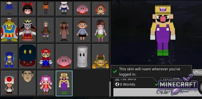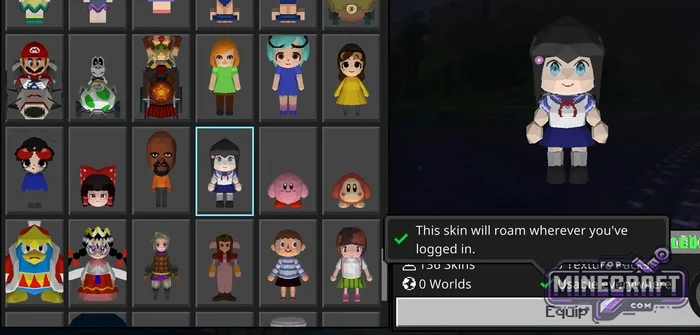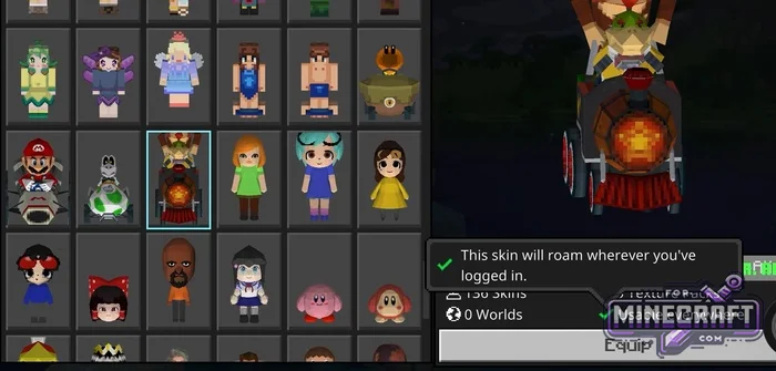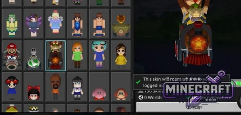 Skins are divided into two categories by color in the menu. Regular 4D models are marked in gold text, while blue text indicates options inspired by server cosmetics. Some characters have additional elements: wings, headgear or even Mario Kart-style transportation. Most skins are available for play in any mode after logging into youre account.