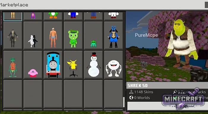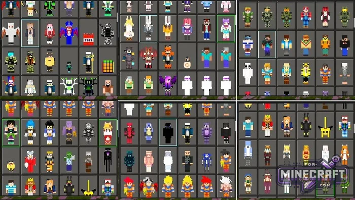 The skin pack includes key Marvel and DC characters. There's Spider-Man in various suits, Iron Man, and the Hulk. Anime section: Goku, Naruto, Luffy, and characters from Demon Slayer. In addition to these models from cartoons like Shrek, SpongeBob and the Minions have been added.
