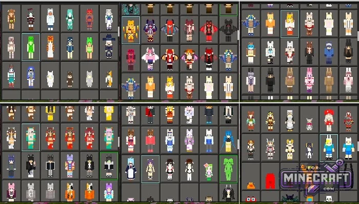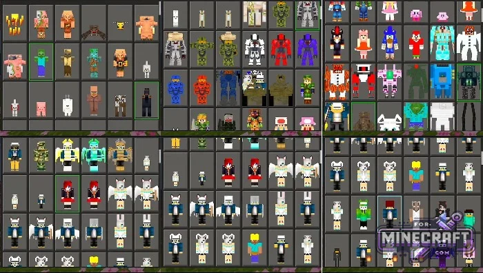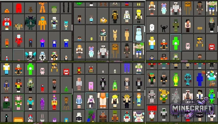 If your tired of being human, turn into a Warden, a Creeper, a zombie, or a regular cow. Visual elements like wings of various shapes tails, and swords on the back have been added to the standard models. Some skins are enhanced with particle effects and glitches.