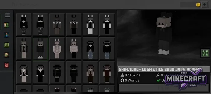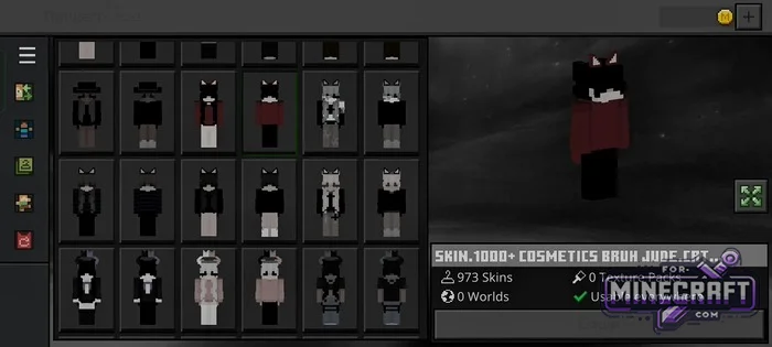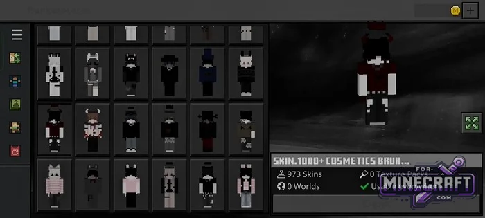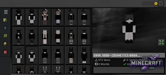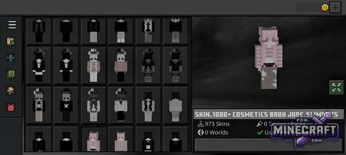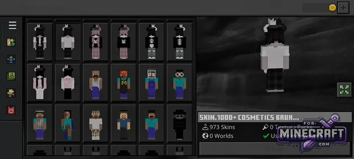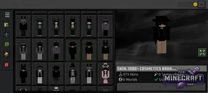 SKIN 1000+ COSMETICS BRUH contains 973 skins - almost a thousand free skins for Minecraft Bedrock 26.30. It comes as a ready-to-use APK, so there's no need to manually import files-provided you have an Android device (phone or tablet, it doesn't matter). Overall, the skins are "Usable everywhere," meaning they work both in single-player and on servers. Download below.