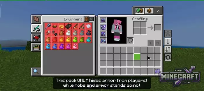 - The pack doesnt affect mobs (zombies, skeletons), leaving their gear visible.