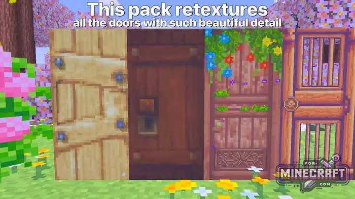 Now each door has its own story and material from which it is made; for example Dark Oak now glows with a yellow window, Cherry is decorated with pixelated flowers and the jungle door has hanging greenery on the leaves. You dont just place a door, it actually feels part of the enviroment
