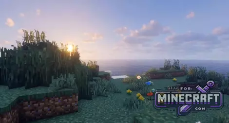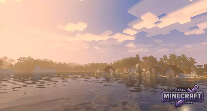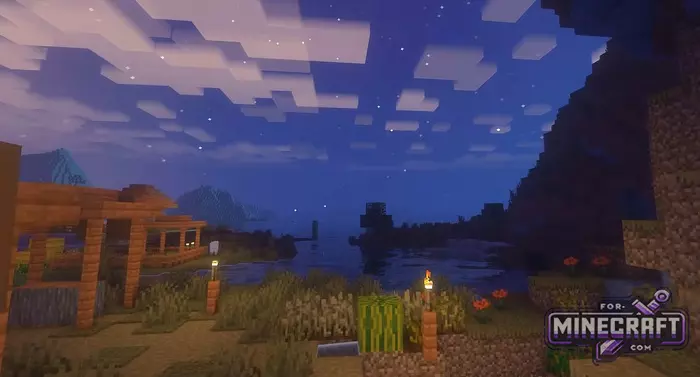 A light scattering system has been implemented giving sunsets and sunrises more orange and pink colors. At night the sky becomes deep with clear stars, but the ground doesnt turn into impenetrable darkness like it does in some other shaders for Bedrock.